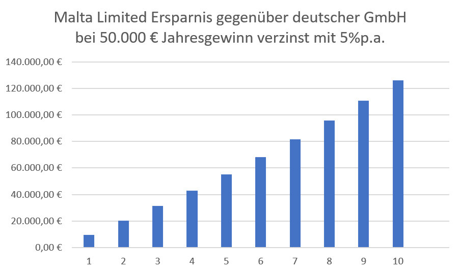 Sie denken das sich eine Firma im Ausland für Sie nicht lohnt? Bereits ab 50.000 € Jahresgewinn lohnt sich der Betrieb einer maltesischen Limited. In nur 10 Jahren verdienen Sie – auch mit Wohnsitz in Deutschland – bei Abwicklung über eine maltesische Limited über 126.303.- Euro mehr als wenn Sie den gleichen Umsatz über eine deutsche GmbH abwickeln.